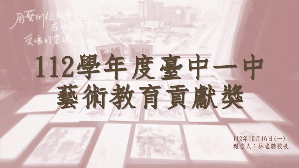 慶祝臺中一中創校110週年及美術班設班30週年, 並祝賀臺中一中榮獲藝術教育貢獻獎,  將在美國臺中一中校友會線上藝術中心的一中美術館舉辦線上藝術特展,讓來自世界各地的一中校友及各界人士都能欣賞到臺中一中對藝術教育的貢獻。
